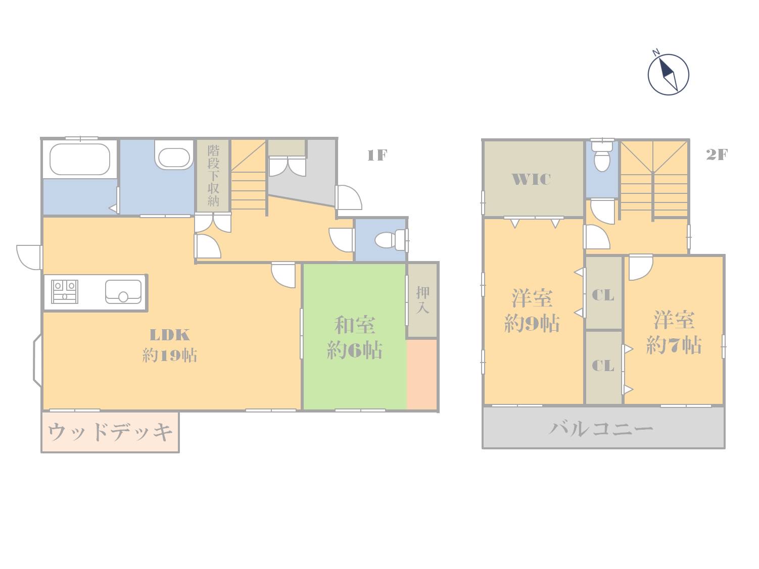 | 設備 | 浴室暖房 浴室乾燥機 浴室に窓あり トイレ2ヶ所 温水洗浄便座 シャワー付洗面化粧台 3口以上コンロ IHクッキングヒーター カウンターキッチン 食器洗浄乾燥機 全居室収納 クローゼット ウォークインクローゼット 床下収納 複層ガラス 出窓 上水道 下水道 側溝 エアコン2台以上 モニタ付インターホン ウッドデッキ 庭 駐車場2台分 |